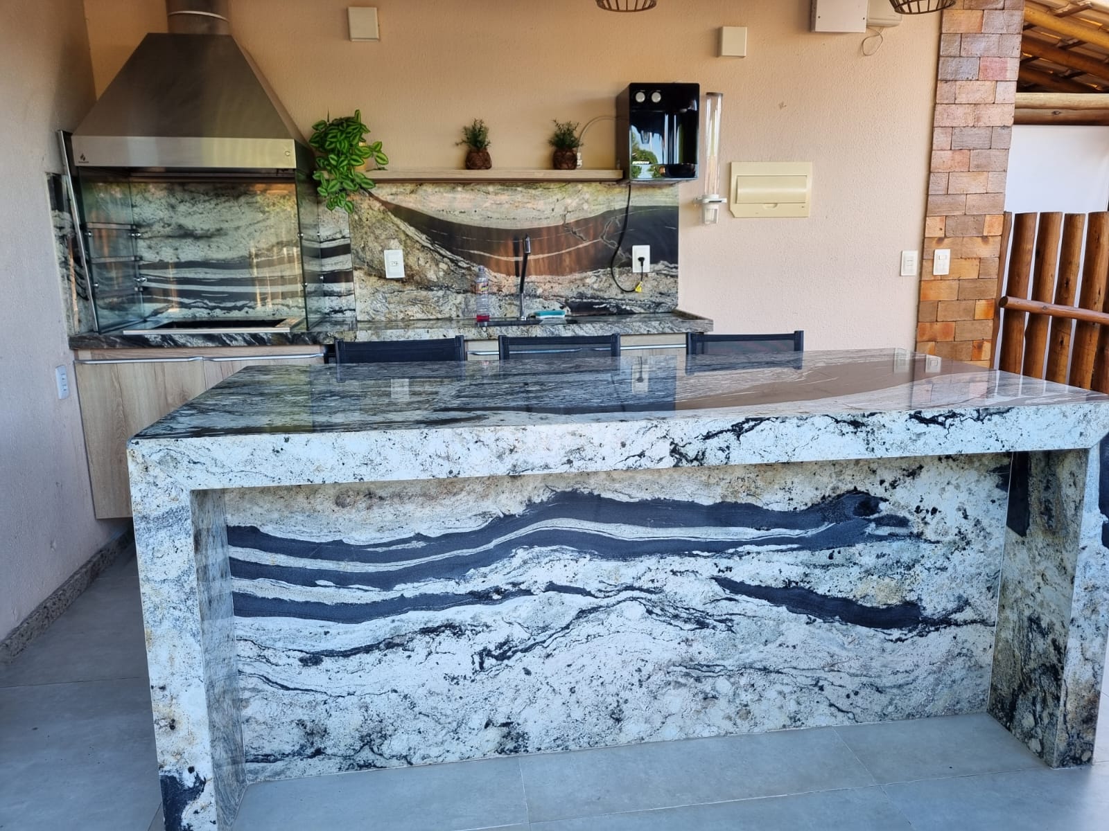 - varanda com área gourmet com balcão e churrasqueira em mármore